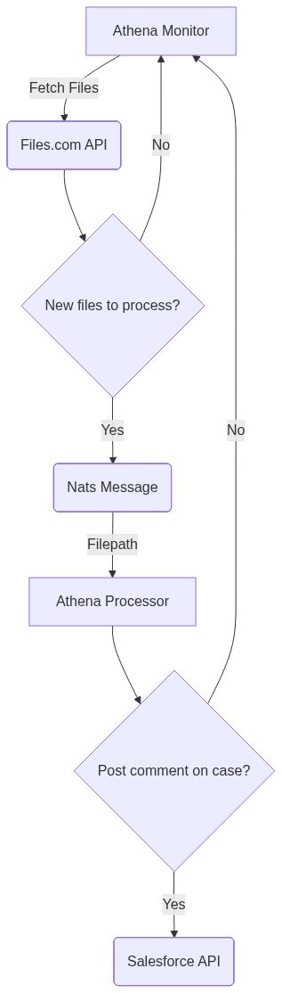 Athena-processor: Subscribes to messages from monitor and routes the reports that have to be run over a given detected file, subsequently it will perform an action on salesforce (such as posting a comment, etc)