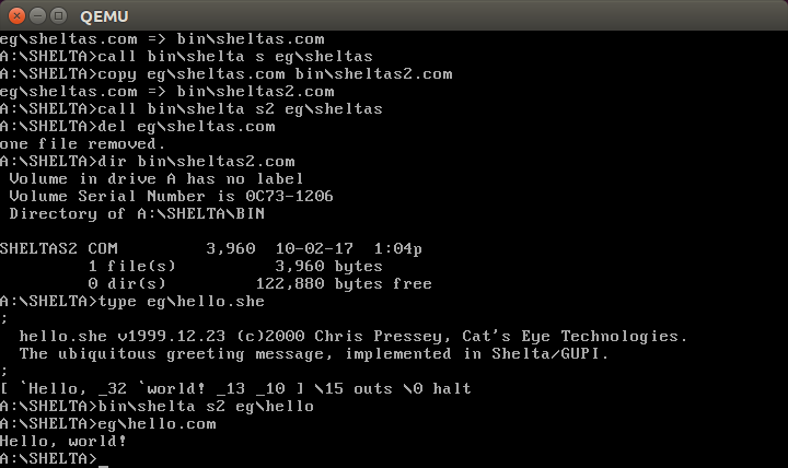 Shelta is an extremely minimal Forth-like language with barely any semantics; it relies on inline machine code to write anything resembling an actual program in it. In the spirit of compilers for languages such as FALSE and brainfuck, a Shelta-to-8086 compiler was implemented (with help from Ben Olmstead) in less than 512 bytes of 80286 machine code. What's more, it's also been bootstrapped — that is to say, a Shelta compiler was written in Shelta, which was compiled with the original compiler, and then compiled again with the resulting compiler, producing a wholly self-hosted executable!
