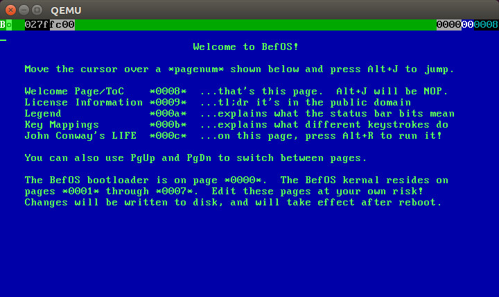 BefOS is an "operating system" for the [IBM PC compatible][] architecture. The phrase "operating system" is in scare quotes for a very good reason; it's not really an operating system at all, it's a glorified sector editor.
