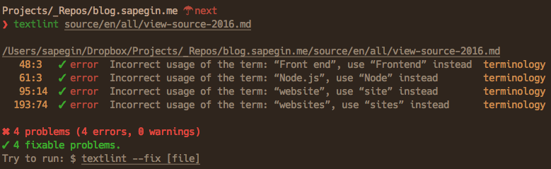 npm install textlint-rule-terminologytextlint --fix --rule terminology Readme.mdYou can configure the rule in your .textlintrc: