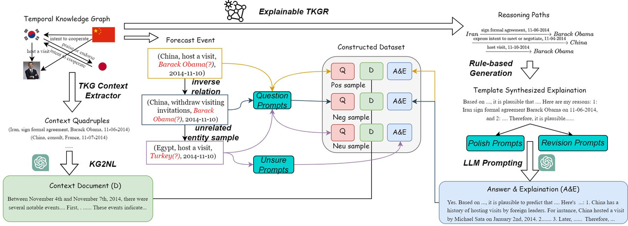 To address this challenge, we propose a novel framework called Temporal Knowledge Graph-instructed Generation (GIG) to produce more accurate and coherent reasoning explanations. The key idea is to leverage temporal knowledge graphs (TKGs), which have been effectively utilized for explainable event forecasting. Our approach first applies explainable TKG reasoning models to generate reasoning paths for a given query about a future event. We then convert these paths into natural language explanations using a two-level prompting technique. Next, we identify relevant context from the TKG and reasoning paths to construct a coherent context document. Finally, we convert the original query into a question to produce a complete training instance.