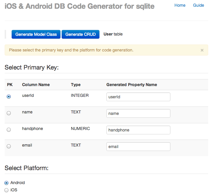 The aim of this project is to generate basic CRUD code for both Android/iOS for local sqlite database access so that the code can be shared between the 2 platforms.