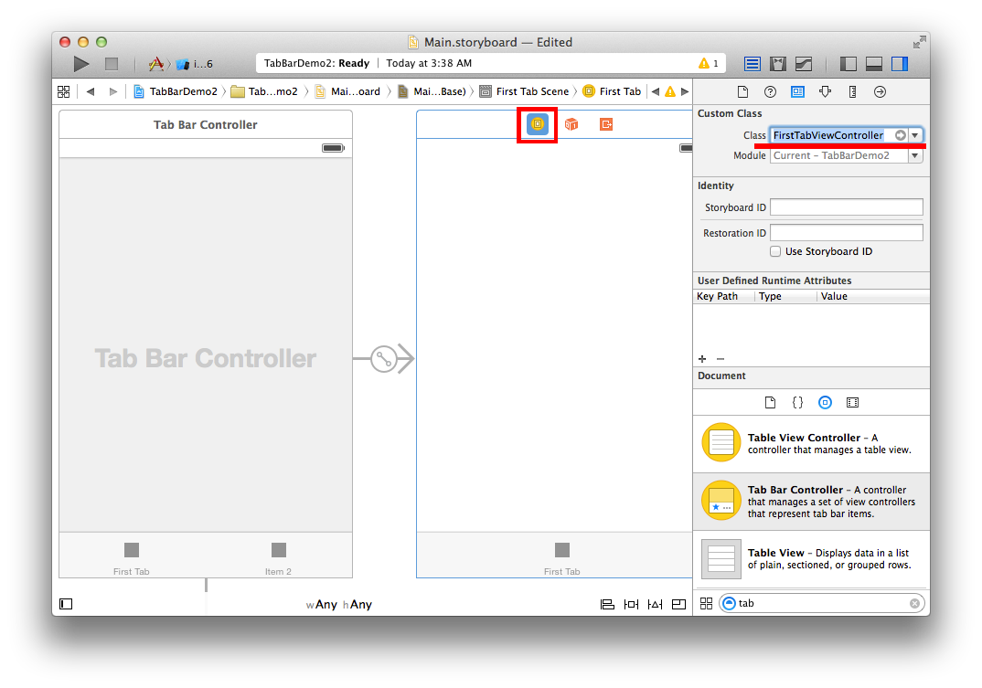 For each tab in your storyboard select the corresponding view controller and set its custom class to one of the classes you just created. You can now add other components to this tab and connect outlets to your view controller class as you would with any other view controller.