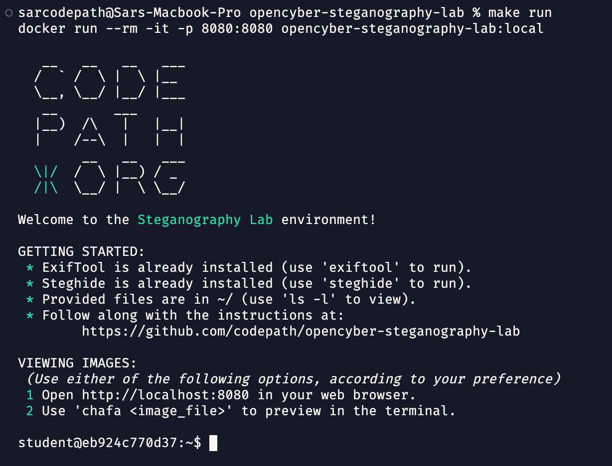 bash- A Unix shell and command language (this is how you will interact with the container)exiftool- A tool for reading and writing metadata in image filessteghide- A tool for hiding and extracting data within image fileschafa- A tool for converting images to ASCII art (optional)
