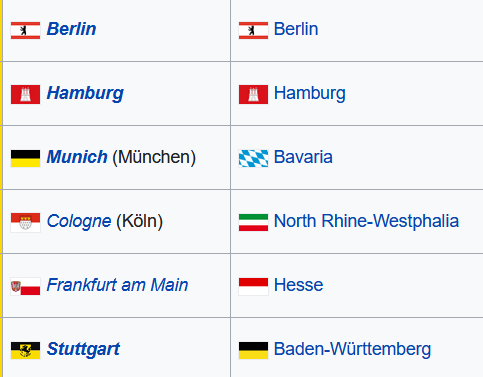 - Cities: 5 largest cities with regard to population besides Berlin in Germany: Berlin, Hamburg, Munich, Cologne, Frankfurt (Main) and Stuttgart)