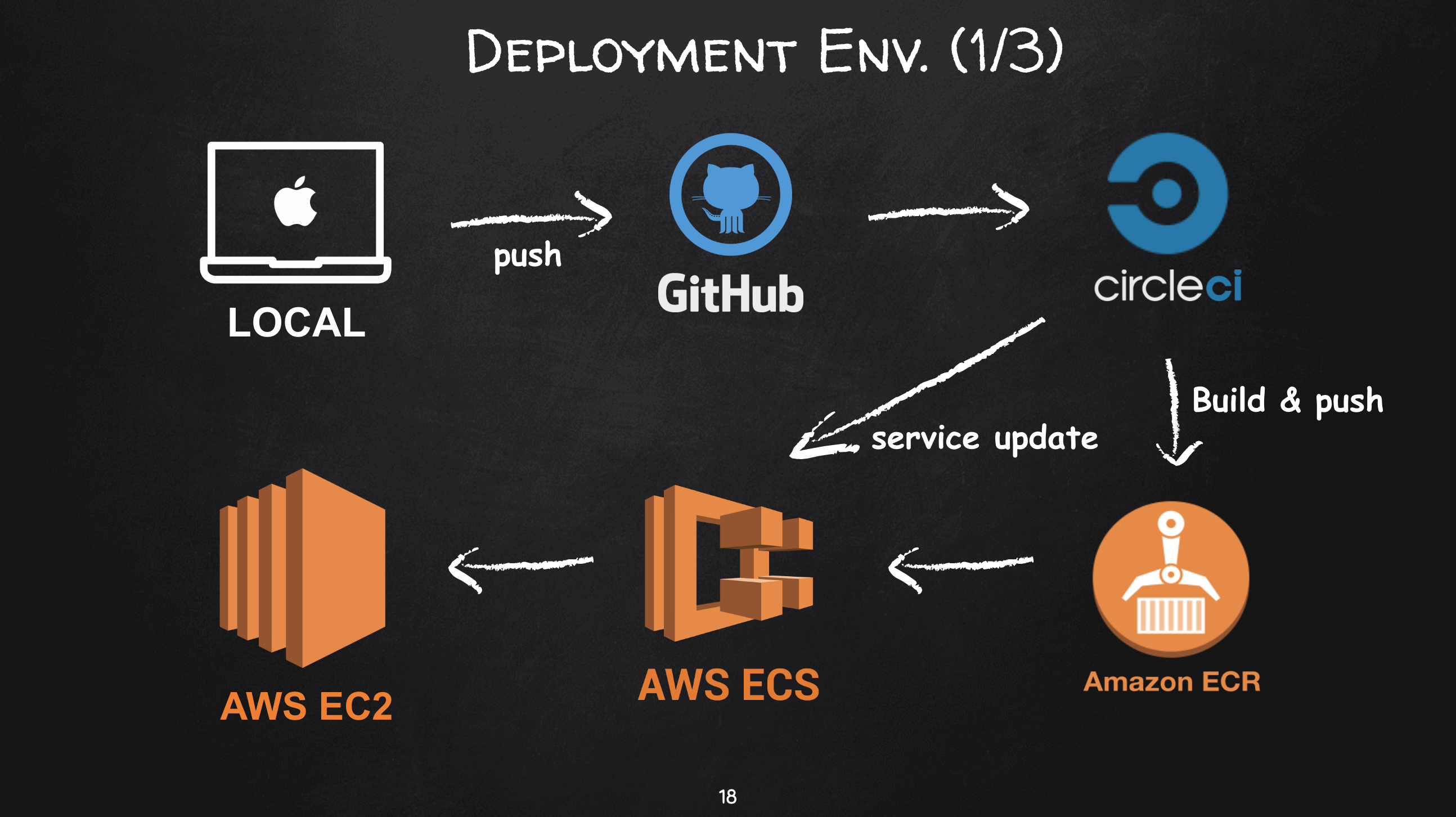| CircleCI | Nginx、Rails コンテナのBuild、ECRへのPush、CLI経由で ECS クラスター上のサービスおよびタスクのアップデート |
