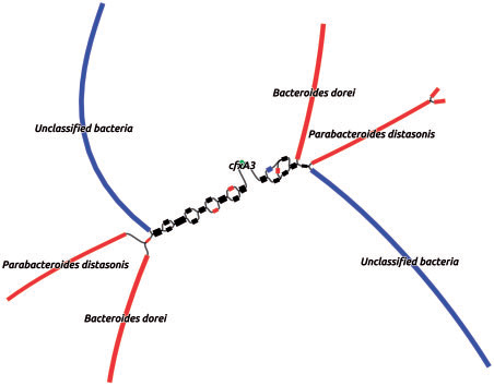 Combined graph of AR gene context produced from two metagenomes of the same subject. Red color denotes the part of the graph present only at the time point 2, blue color — only at the point 3, black — at both points; green color denotes the graph nodes corresponding to the target AR gene
