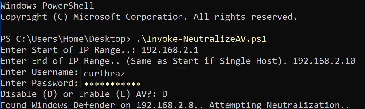 The assumption is being made that you are first running as SYSTEM or at least a Local or Domain Admin that can elevate to SYSTEM on a Windows OS with PowerShell. If AV is enabled on the host you plan to run this scipt on, it will likely need to be neutralized there first before this can be leveraged to disable remote targets. I was forced to remove my blog that explains in detail how this works.
