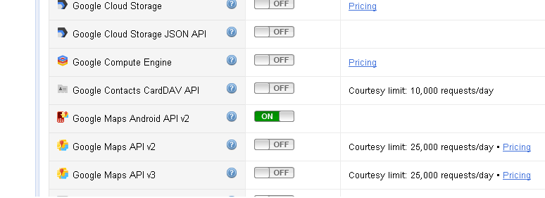 - Under "Services" enable Google Maps Android API v2 and accept terms