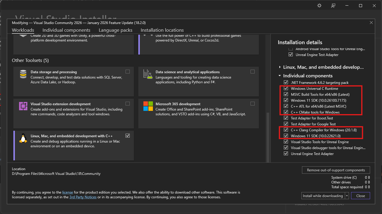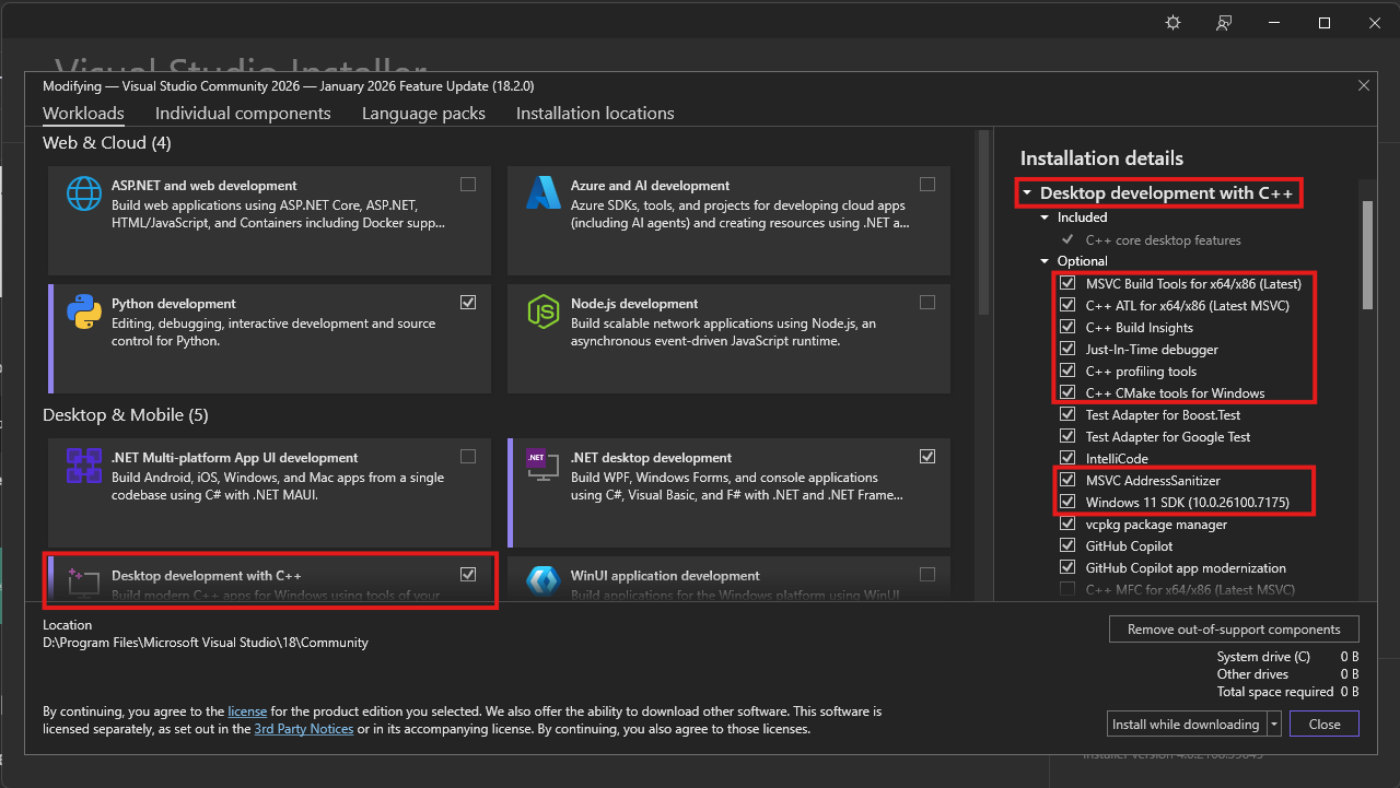 Make sure you have installed these packages with Visual Studio Installer in order to compile C++ codebases: