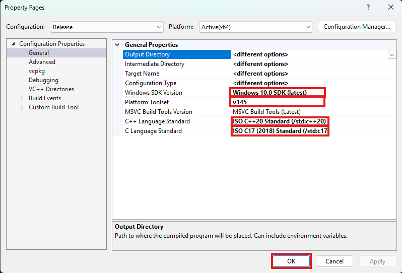- Platform Toolset is the most important part for your build to succeed! Select the highest number you see. v145 is for Visual Studio 2026. If you are running Visual Studio 2022 you won't have that, you will have v143, select that one, same goes for older Visual Studio versions.