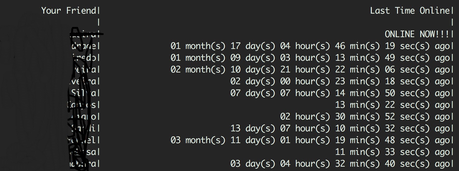 $ tinderonline -h# Show your friends that use Tinder, and who much time since their last usage