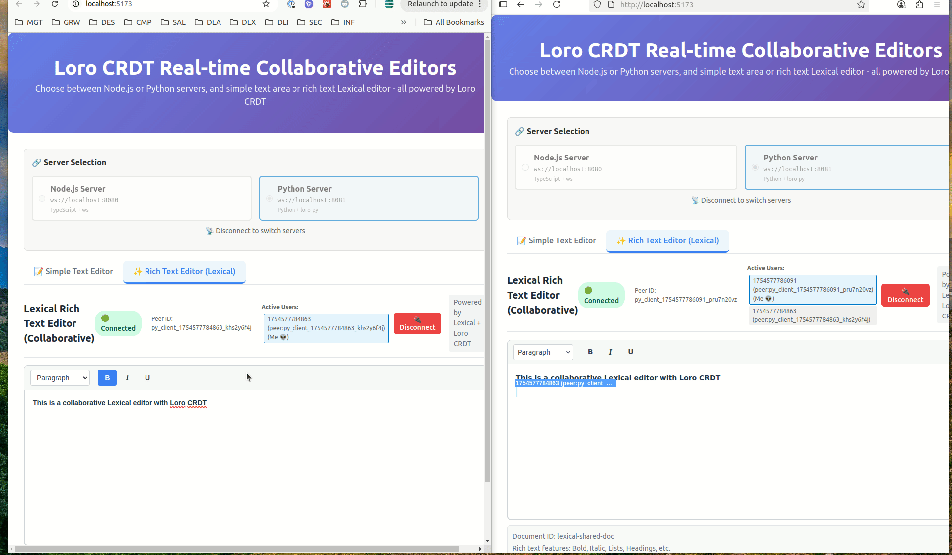 LoroCollaborativePlugin.tsx- A Lexical plugin that integrates Loro CRDT for real-time collaborative editingLexicalModelPython Library - A standalone document model for Lexical content with CRDT capabilitieslexical-loroWebSocket Server - A Python server using loro-py for real-time collaboration