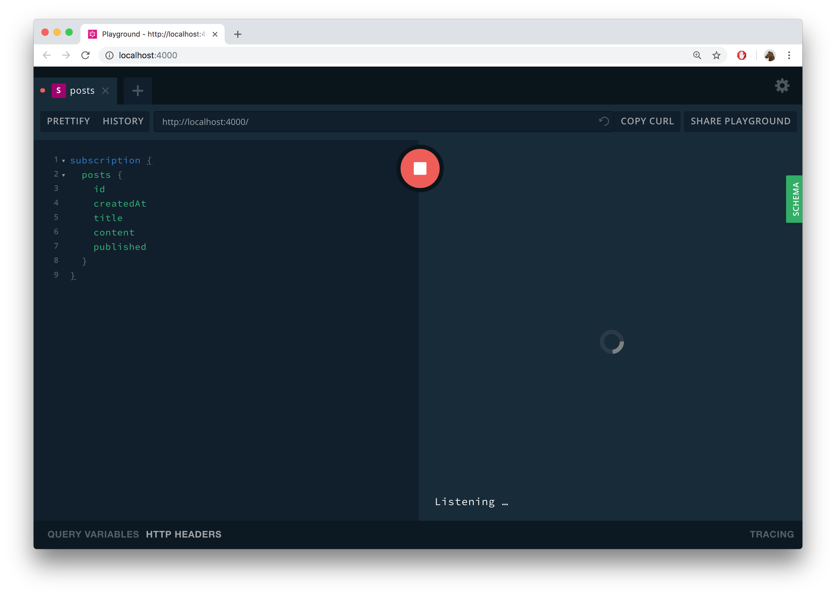To test the post subscription, you need to send a subscription query in the Playground, e.g.: