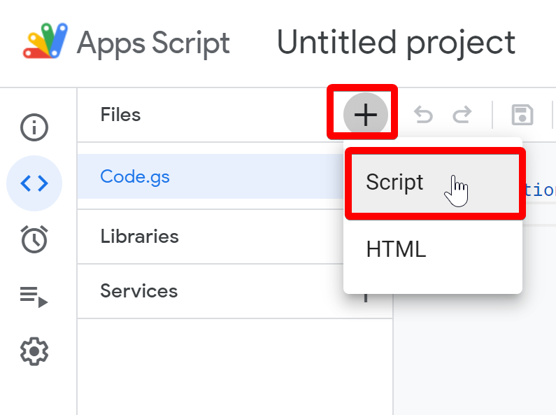 .gsfile you'll want to do the following:- Click the "+" button in the Files section. The select "Script"