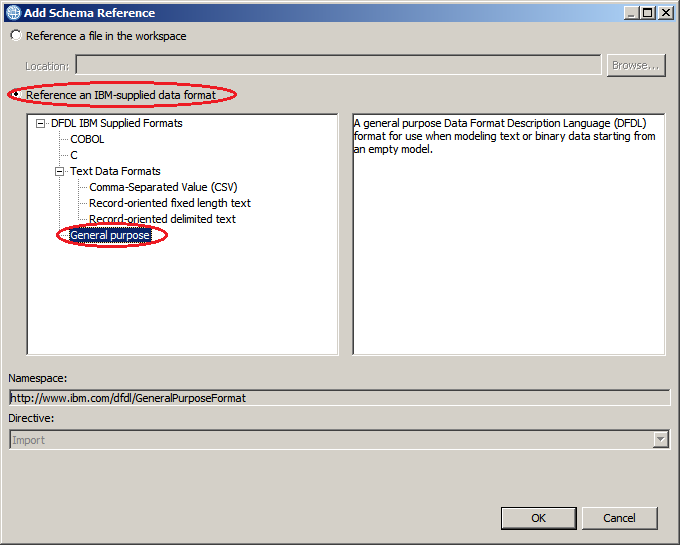 Since GeneralPurposeFormat.xsd has not been included to avoid a possible copyright issue. Until I can confirm that including it here is allowed, you must procure it by other means and copy it to IBMdefined. Fortunately, you can also reference the file within IIB Toolkit itself by following the below steps: