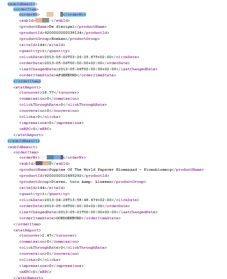 Example in PHP to get reporting with the subid's within the bol.com partnerprogramma. See example response in the screenshot for the output. A specific API key is needed that can be requested at [email protected] to get this for you account.