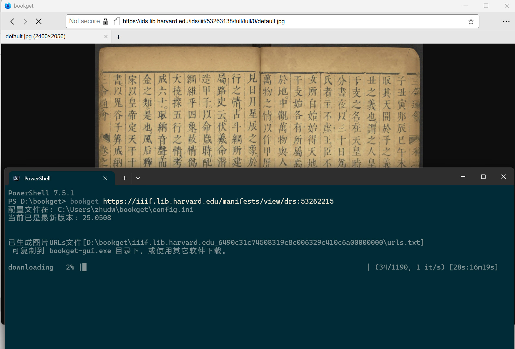 - 你需要观察 bookget 和 bookget-gui 两个窗口上的提示信息。bookget-gui 会不断切换图片URL显示到浏览器中。