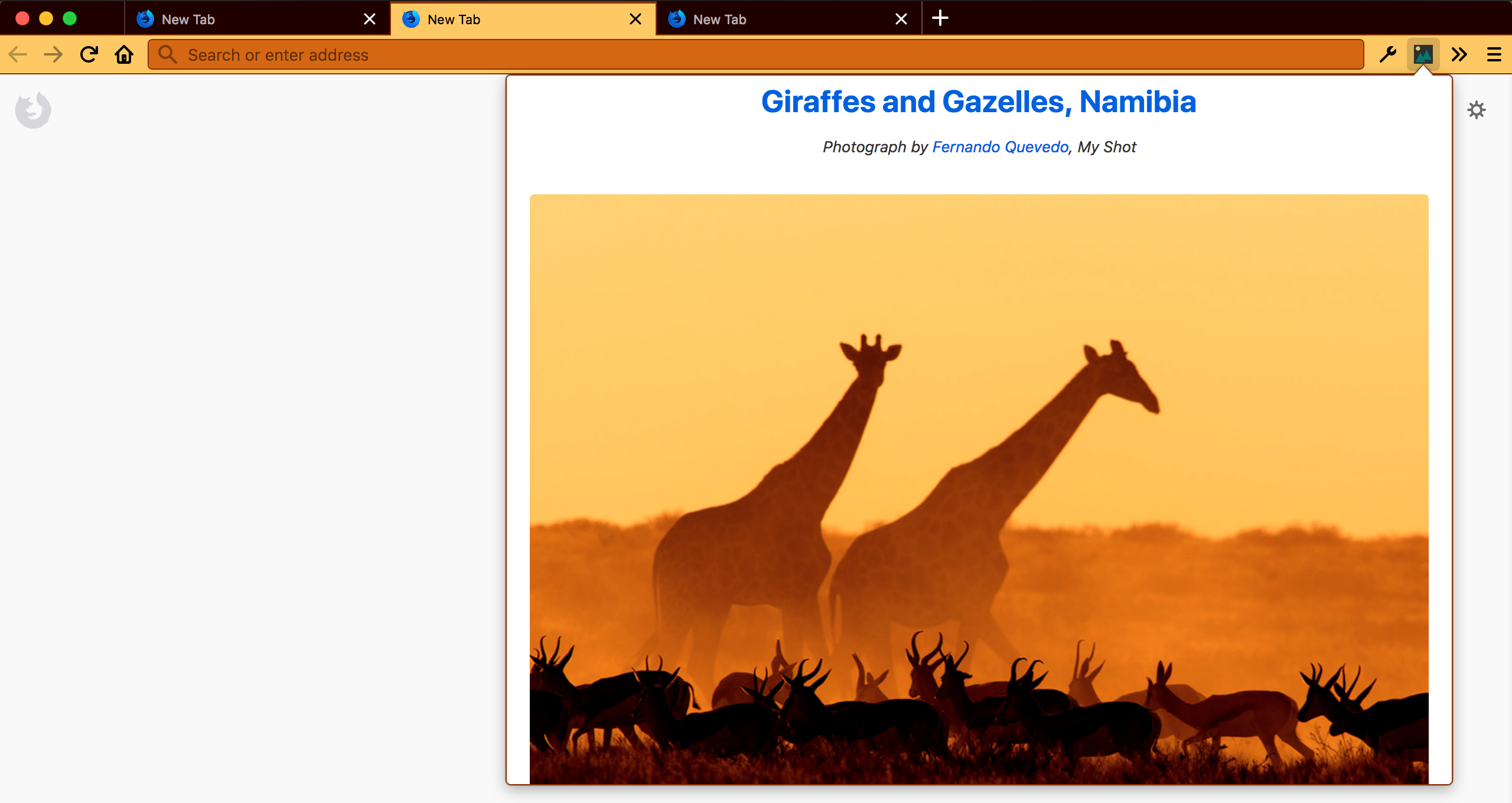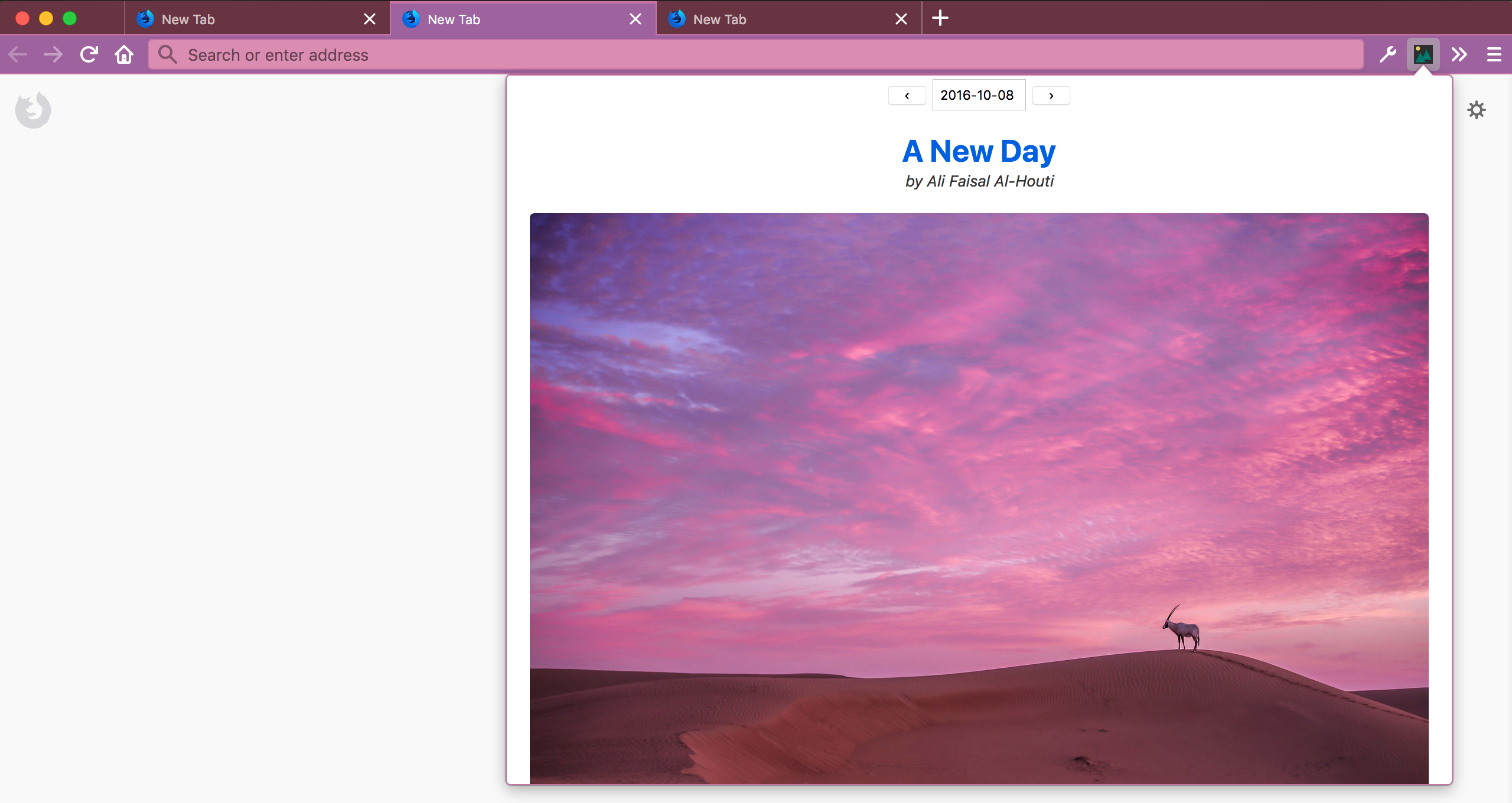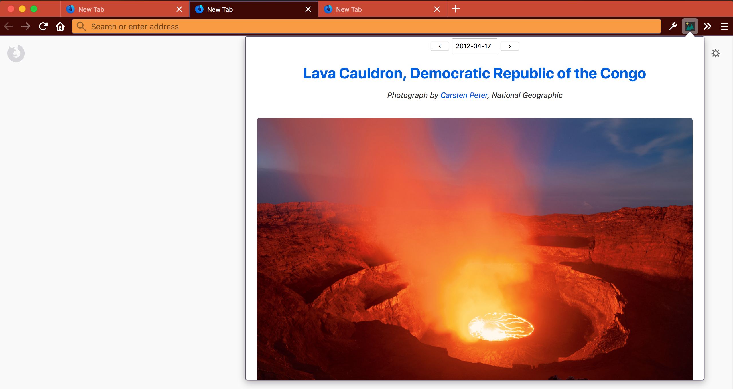 A dynamic Firefox theme that uses the color palette of the current National Geographic Photo of the Day. The theme automatically updates every day, and you can click the toolbar button to see the picture and click through to the National Geographic page. You can also view past pictures and themes by changing the date in the popup. If you'd like to turn off the automatic updates and keep the theme on a particular date, change the setting in the extension's preferences page.
