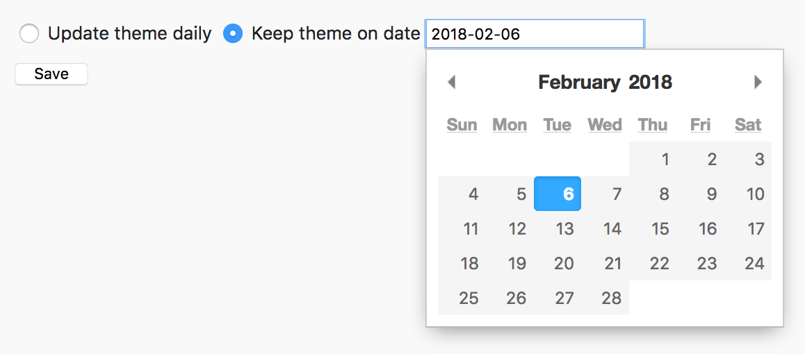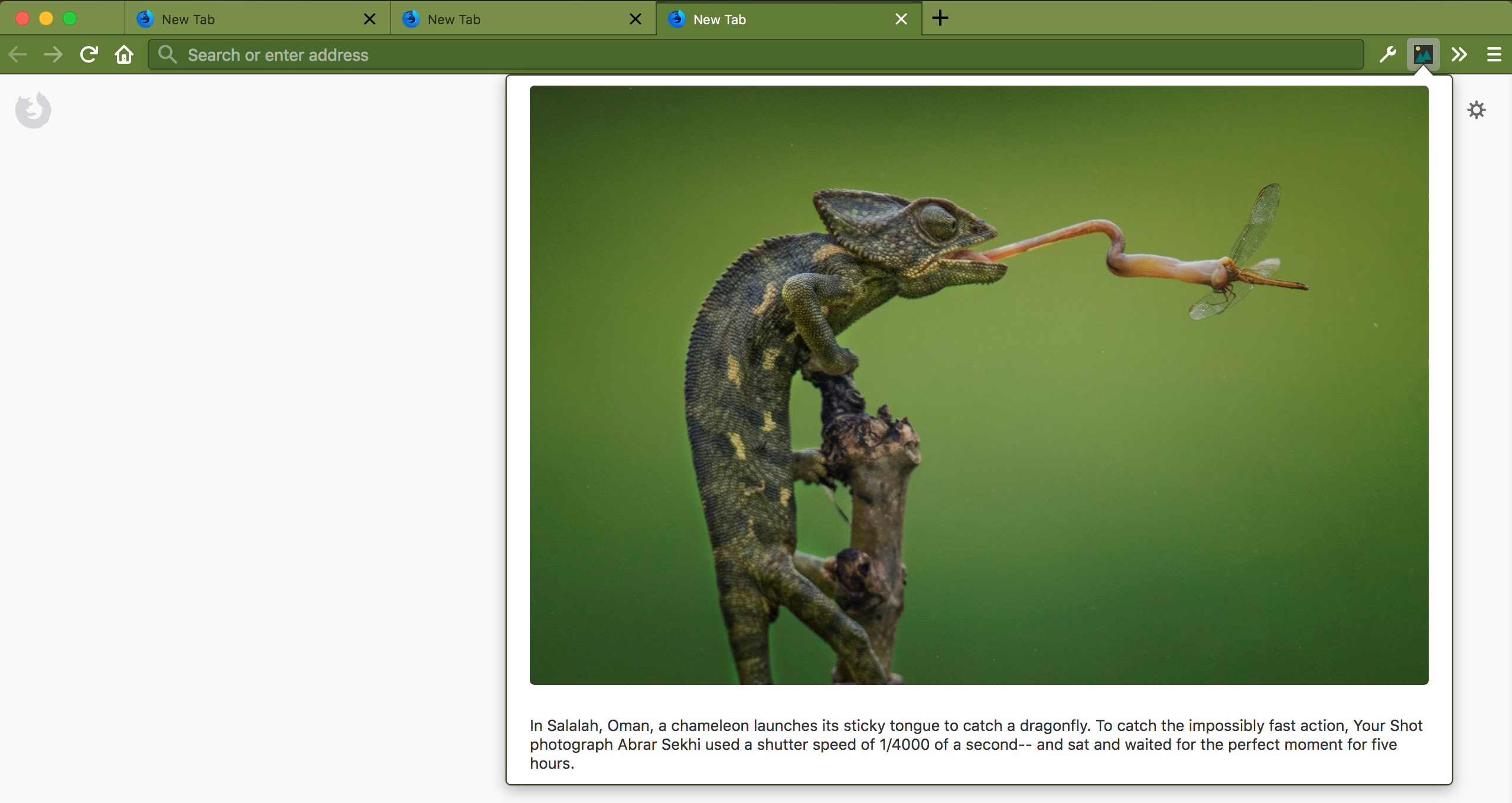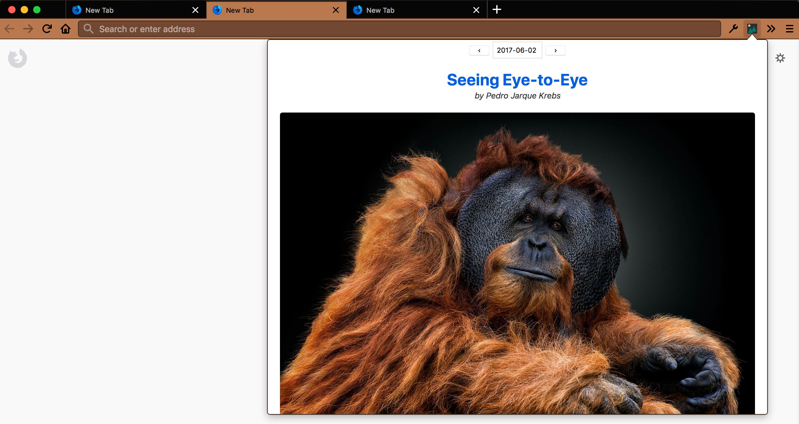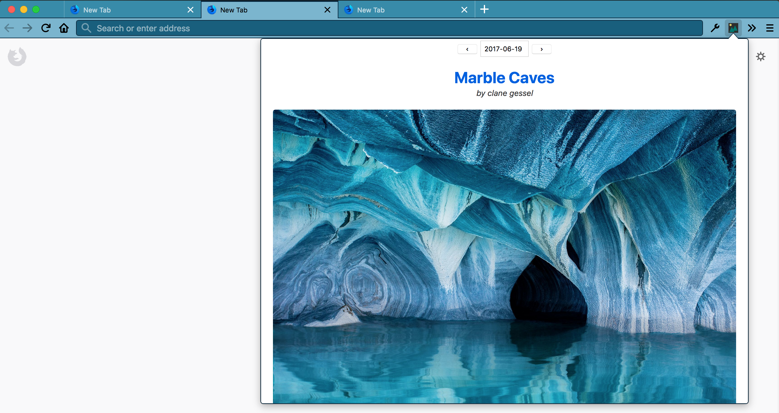 A dynamic Firefox theme that uses the color palette of the current National Geographic Photo of the Day. The theme automatically updates every day, and you can click the toolbar button to see the picture and click through to the National Geographic page. You can also view past pictures and themes by changing the date in the popup. If you'd like to turn off the automatic updates and keep the theme on a particular date, change the setting in the extension's preferences page.