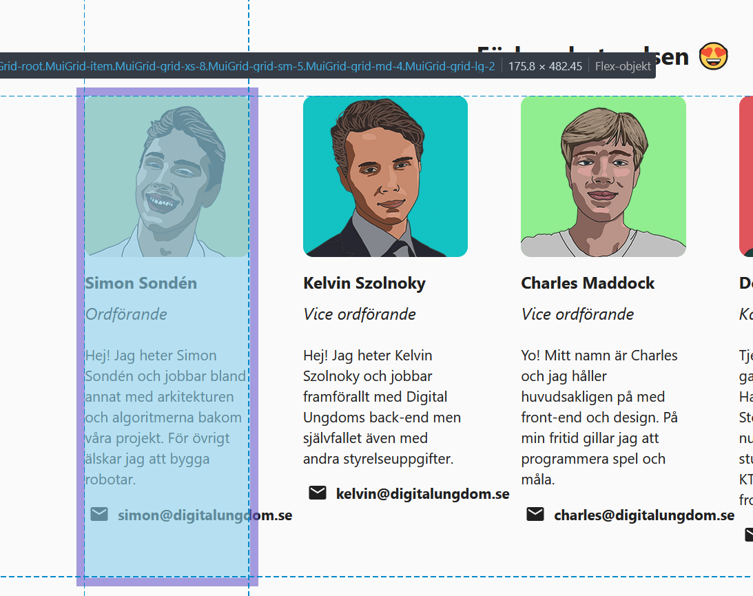 Just because I know you can be peculiar, you should notice the trade-off between email being aligned and having a reasonable layout for the ProfileCards. Currently there are 4 members on the top row and 1 on the bottom. @Zigolox |
