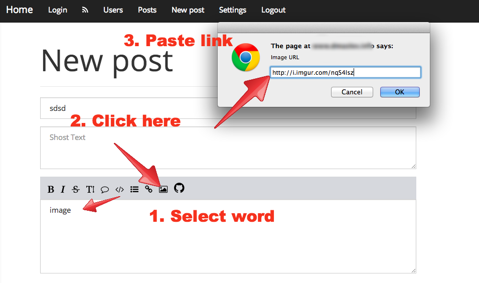 To insert an image you also need to select a word that will be used like a title attribute and paste the image URL into the dialog window.