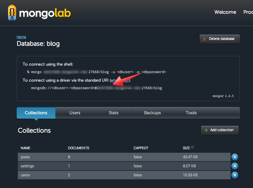 If you are using mongolab, please copy the outlined on the screenshot line to connect using driver, type in your dbuser and dbpassword and paste the line into the CONNECTION_STRING variable in the config.py file.