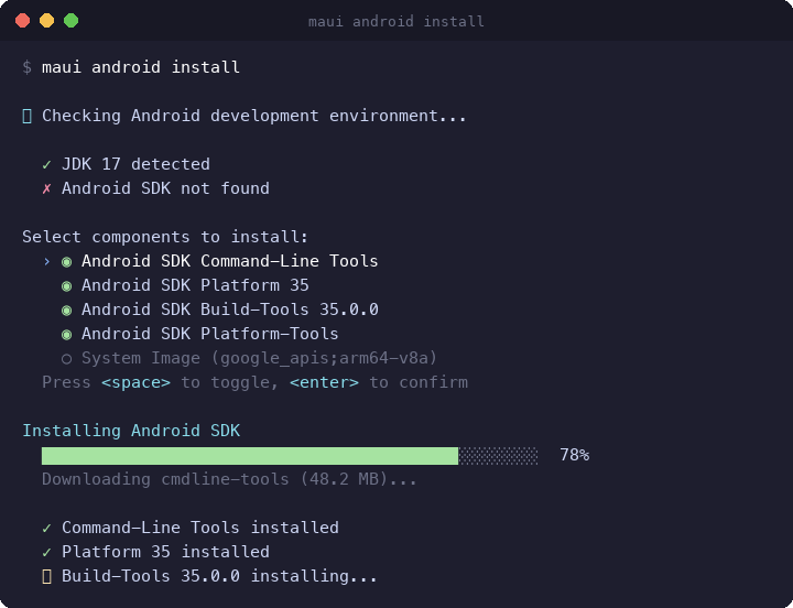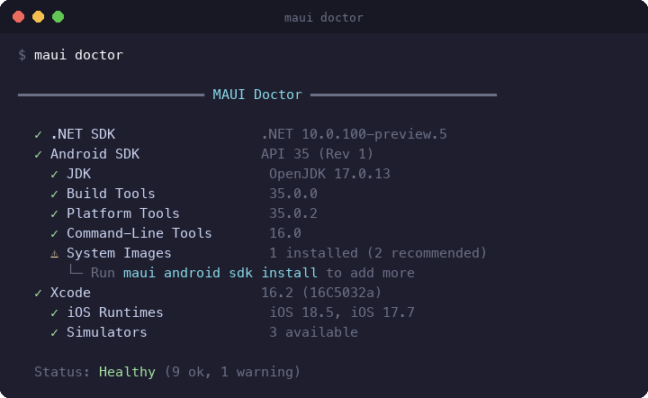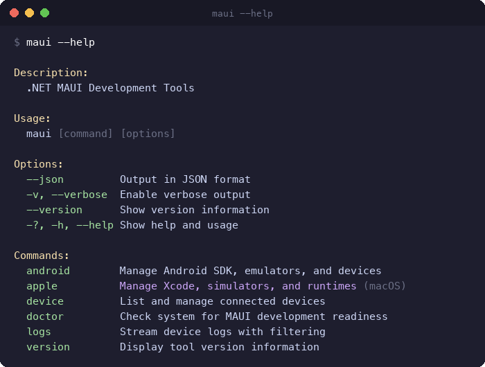 maui --helpmaui doctor— Environment diagnosticsmaui device list— Cross-platform device listingmaui android install— Interactive SDK setupSpec PRs