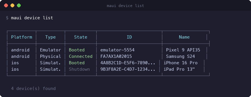 maui device listcommand spec to CLI design doc #34277Key Features