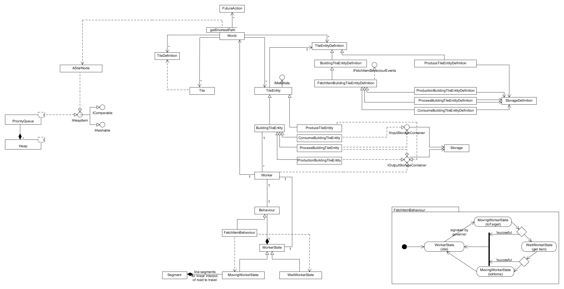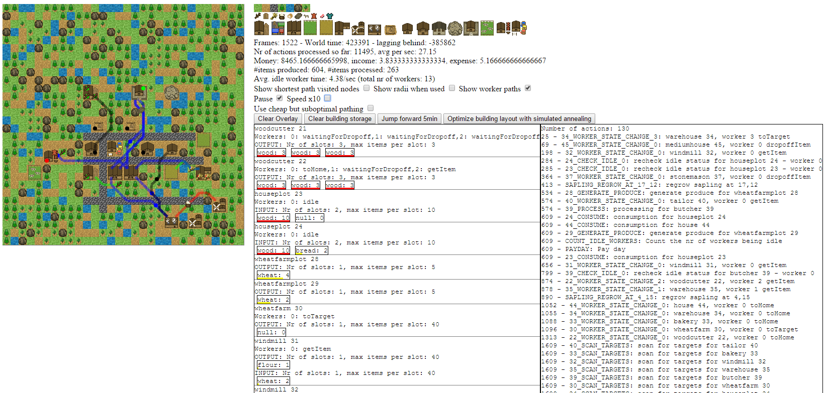 Example engine to simulate Anno or Dwarf fortress like behaviour with tiles, "workers" and their behaviour, storage of buildings, etc. Uses discrete event simulation (DES) to queue up events. Because everything is predetermined and in order on a "world time" in the queue, you can do fun stuff like speeding up the simulation or skipping ahead whole chunks of time.