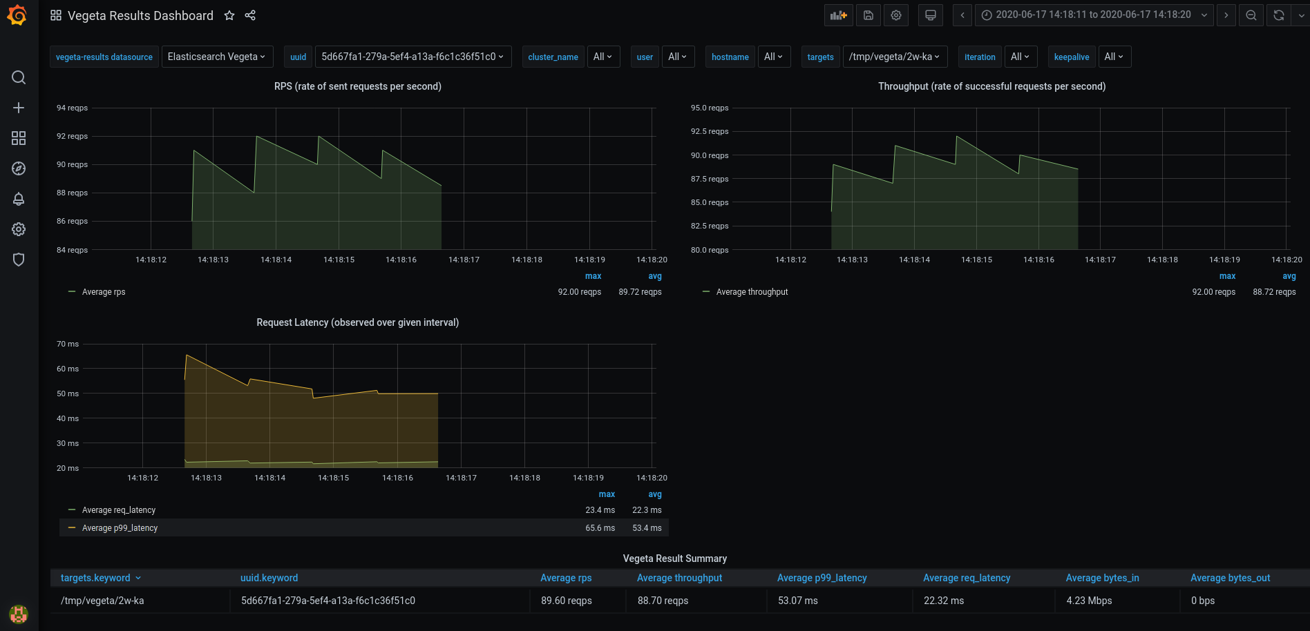 - vegeta-benchmark-{{ trunc_uuid }}It's possible to index reults in Elasticseach specifing using a configuration like the below.