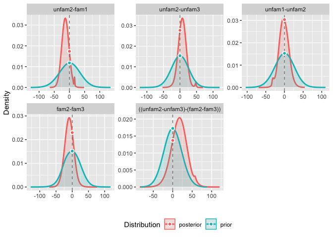 My intuition is that it is completely fine that the priors on the contrasts differ, as long as I don't start comparing contrasts with different priors. In other words, I can test ((unfam2-unfam3)-(fam2-fam3)) and ((unfam2-unfam3)-(unfam1-unfam2), but I can't compare ((unfam2-unfam3)-(unfam2-fam1)) because these two contrast comparisons have different priors.