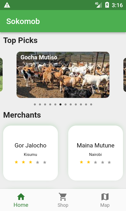 | Home Screen | Main dashboard | Seller carousel, featured products, navigation |