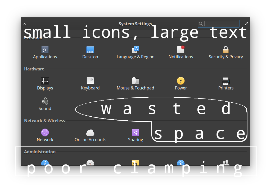 Here's switchboard in it's inital state (elementary:dark theme). Here's an infographic to illustrate some of the shortcomings I see with the current design of switchboard itself. Because the icons are so far apart, there ends up being a lot of emptiness in the window. Of course this depends on the number of plugs one has installed, but in any case the distance between icons is larger than necessary. The text being wider than the icons is not a good look; I'd go so far as to say we don't need text lables under the icons at all: the existing tooltips are sufficient (the icons themselves should communicate their purpose; better not to rely on linguistic interface). Another issue with the inital window state is that it does not consider content. It doesn't have to show all icons at once, but it shouldn't cut off the lower half of a row of icons. If we stick with this format, it should clamp to a number of whole rows (four or five, preferrably five). Here's what it looks like maximized. There's a lot of empty space; it would look better if the icons distributed and scaled to fill it evenly. |