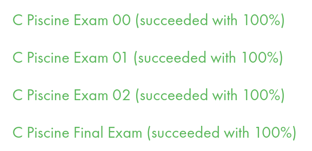 Ce repo contient les projets réalisés lors de ma piscine C à 42. La piscine C est un mois intensif de programmation en C pour intégrer l'école 42. La piscine permet d'apprendre les bases d'Unix, de la programmation en C et de donner un avant-goût de la pédagogie de l'école, basée sur le peer-learning.