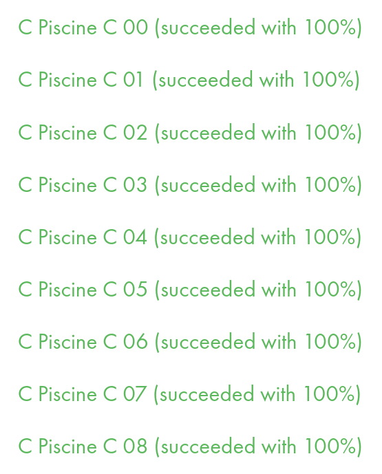 Le C est au cœur de la piscine. Tout le code que vous écrirez devra être à la norme de l'école (et donc passer la norminette). La correction automatique est très stricte: votre code doit être parfaitement à la norme et fonctionner dans TOUS les cas.