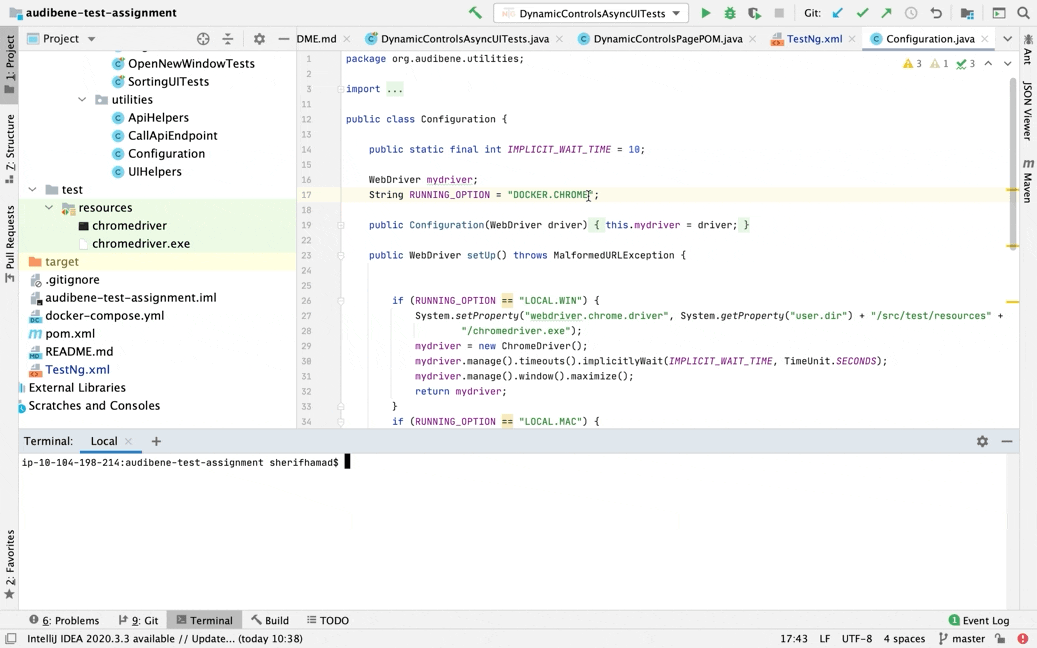 Test can be executed on chrome driver or on docker, to switch between both the following property in Configuration class needs to be set