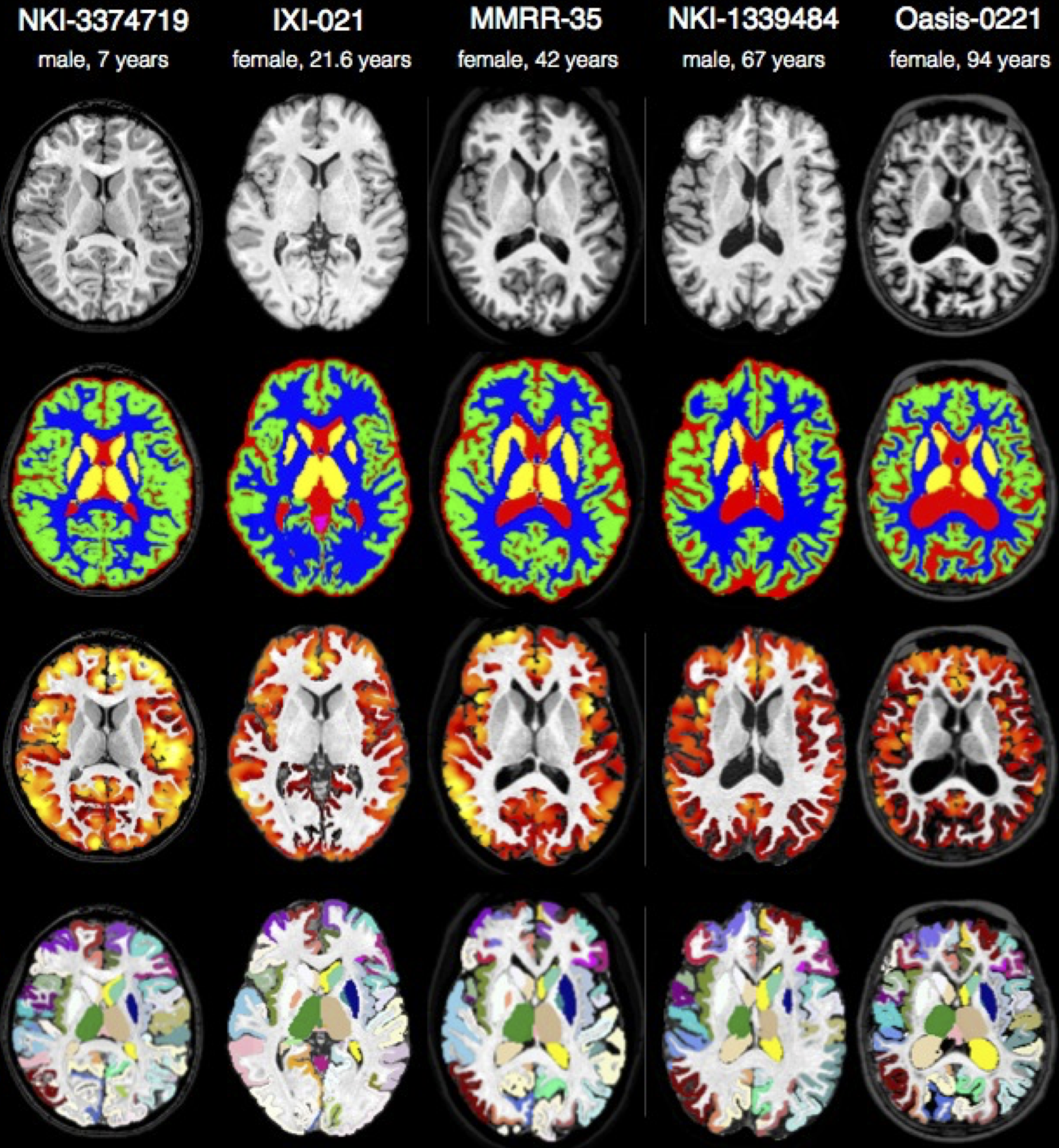 We will analyze multiple modality neuroimaging data with Advanced Normalization Tools (ANTs) version >= 2.1 [1] (http://stnava.github.io/ANTs/). ANTs has proven performance in lifespan analyses of brain morphology [1] and function [2] in both adult [1] and pediatric brain data [2,5,6] including infants [7]. ANTs employs both probabilistic tissue segmentation (via Atropos [3]) and machine learning methods based on expert labeled data (via joint label fusion [4]) in order to maximize reliability and consistency of multiple modality image segmentation. These methods allow detailed extraction of critical image-based biomarkers such as volumes (e.g. hippocampus and amygdala), cortical thickness and area and connectivity metrics derived from structural white matter [13] or functional connectivity [12]. Critically, all ANTs components are capable of leveraging multivariate image features as well as expert knowledge in order to learn the best segmentation strategy available for each individual image [3,4]. This flexibility in segmentation and the underlying high-performance normalization methods have been validated by winning several internationally recognized medical image processing challenges conducted within the premier conferences within the field and published in several accompanying articles [8][9][10][11].