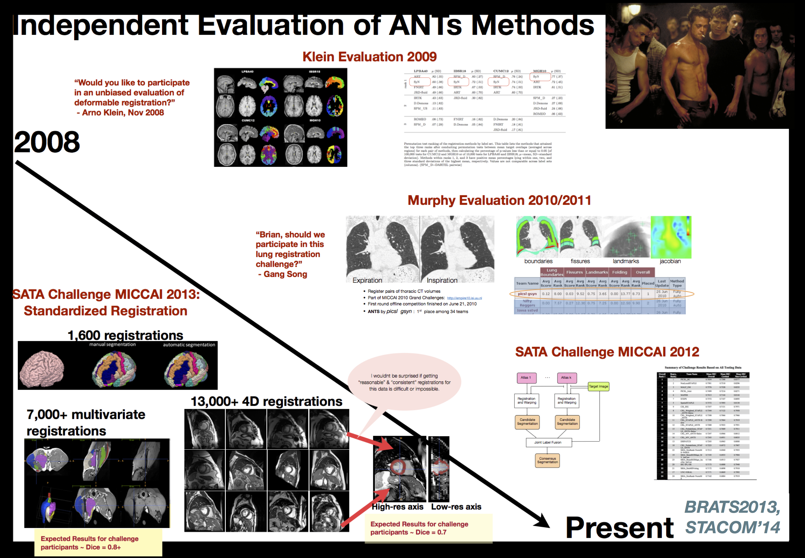 Diffeomorphisms: SyN, Independent Evaluation: Klein, Murphy, Template Construction (2004)(2010), Similarity Metrics, Multivariate registration, Multiple modality analysis and statistical bias