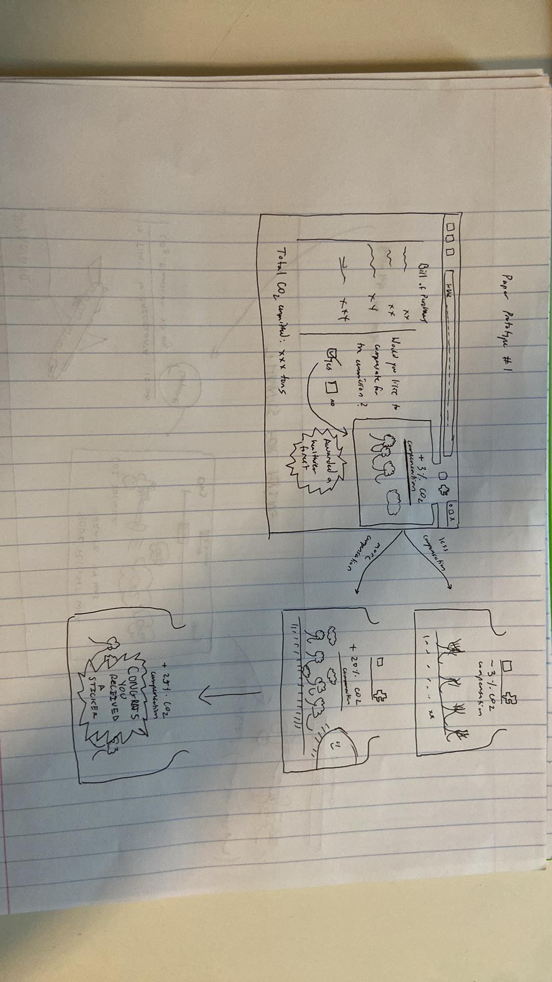 Our service offers many ways to redeem those tokens, as we have a store and many partnerships that offer our users discounts on products, the possibility to do more CO2 compensation(use the tokens to plant more trees) as well as a social media sharing possibility. Paper prototyping made us reflect on the amount of info we want to add when offering a green buying choice, it also made us reflect how to present the options in terms of colors and extra steps that the user has to make before checking out.