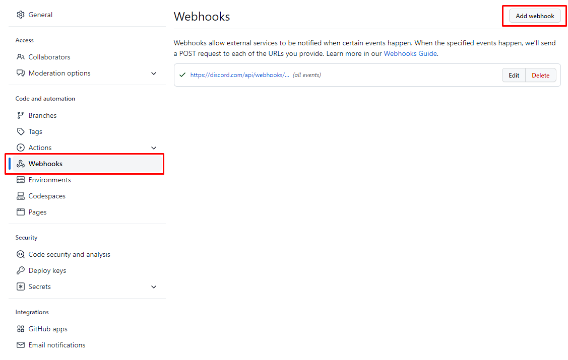 Nas configurações desse canal, encontre a opção Webhooks e crie um novo webhook. Observação: NÃO forneça este URL ao público. Qualquer pessoa ou serviço pode postar mensagens neste canal, mesmo sem precisar estar no servidor. Mantenha-o seguro!