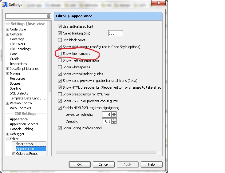 打开软件的菜单File->Settings->Editor->Appearance,在右侧的配置Show line numbers打勾: