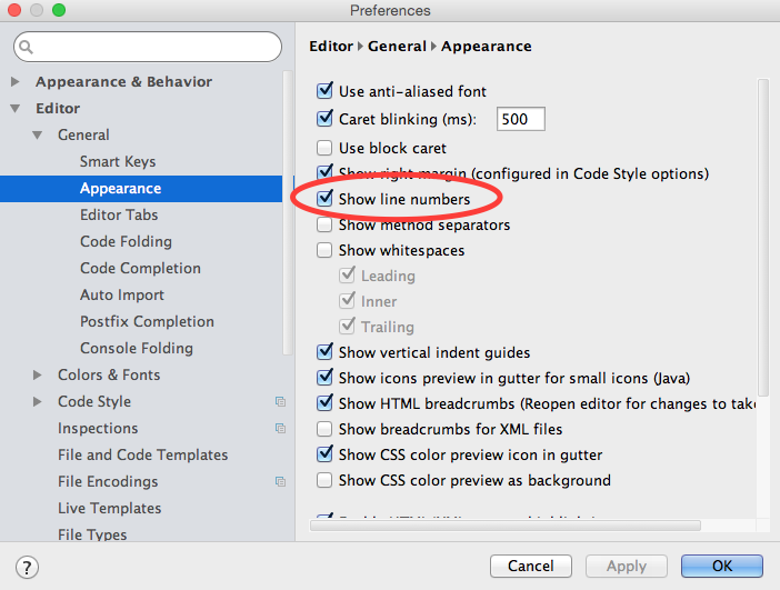 打开软件的菜单File->Settings->Editor->General->Appearance,在右侧的配置Show line numbers打勾: