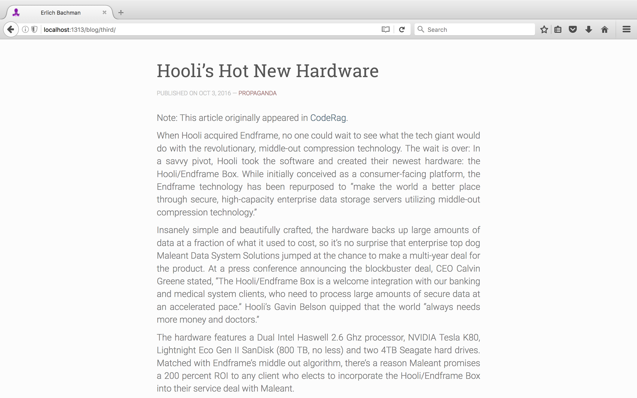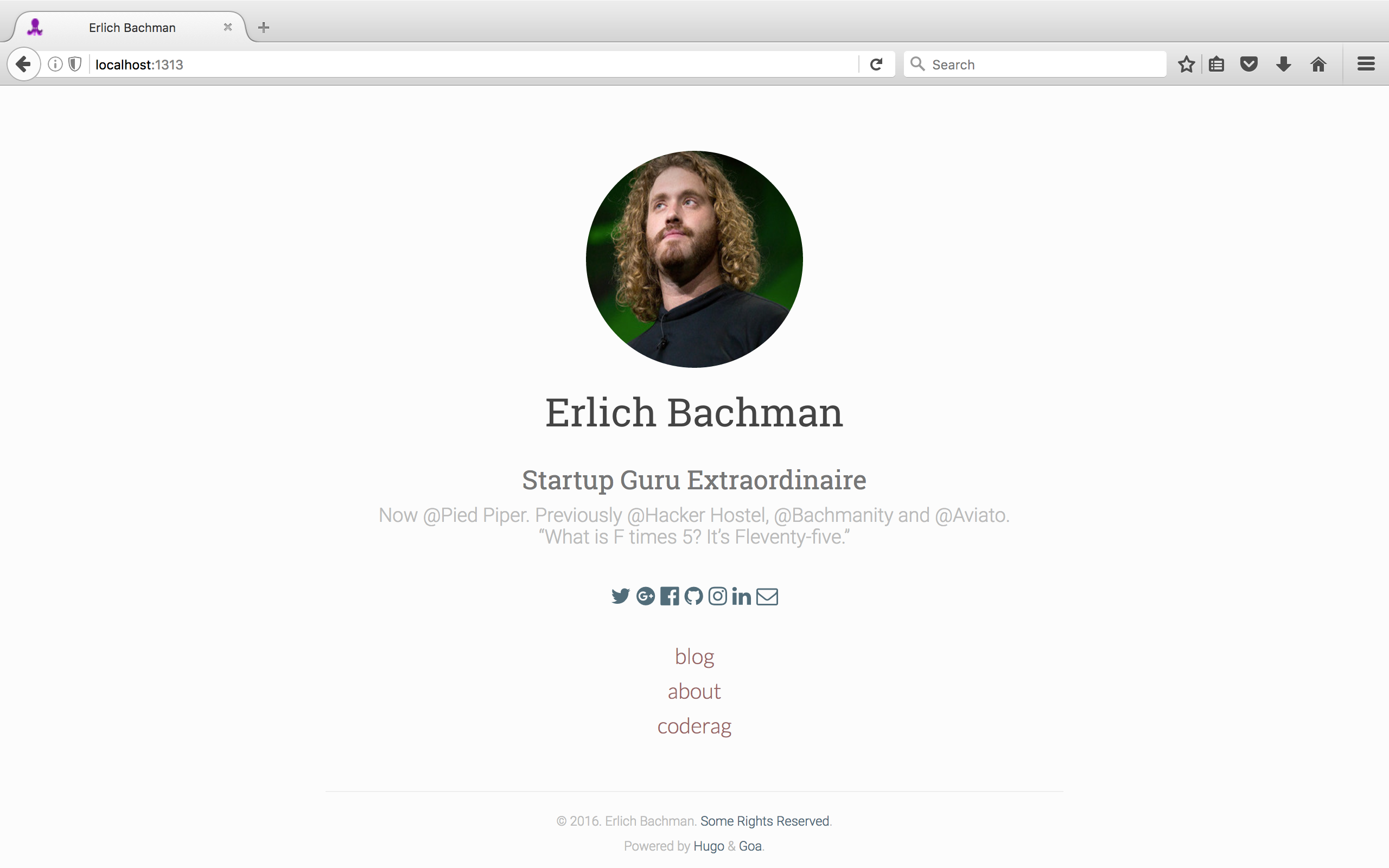 author: Main author name. eg.Erlich Bachman.intro: Author introduction. This field supports markdown. eg.Startup Guru Extraordinaire.description: Author description. This field supports markdown. eg.Now @Pied Piper. Previously @Hacker Hostel, @Bachmanity and @Aviato. <br/> \"What is F times 5? It's Fleventy-five.\".authorimage: Location of author image under static/img directory. eg.headshot.jpgdateformat: Golang date format to be used on this site. eg.Jan 2, 2006