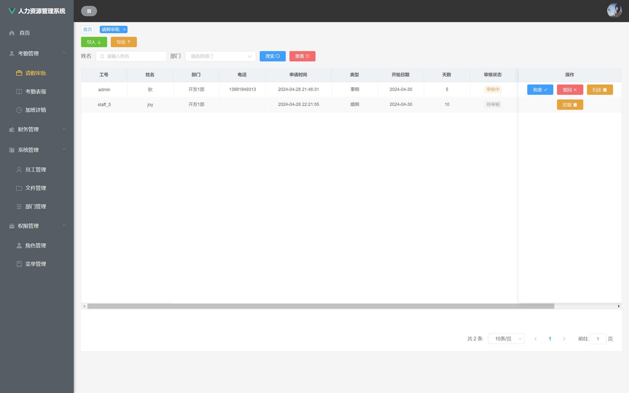 对员工的请假进行审批,比如通过或驳回。员工申请请假之后,等待相关人员进行审批。如果审批通过,则将员工休假时间段的考勤状态设置为休假(但当请假类型是调休时,考勤状态要设为调休)。