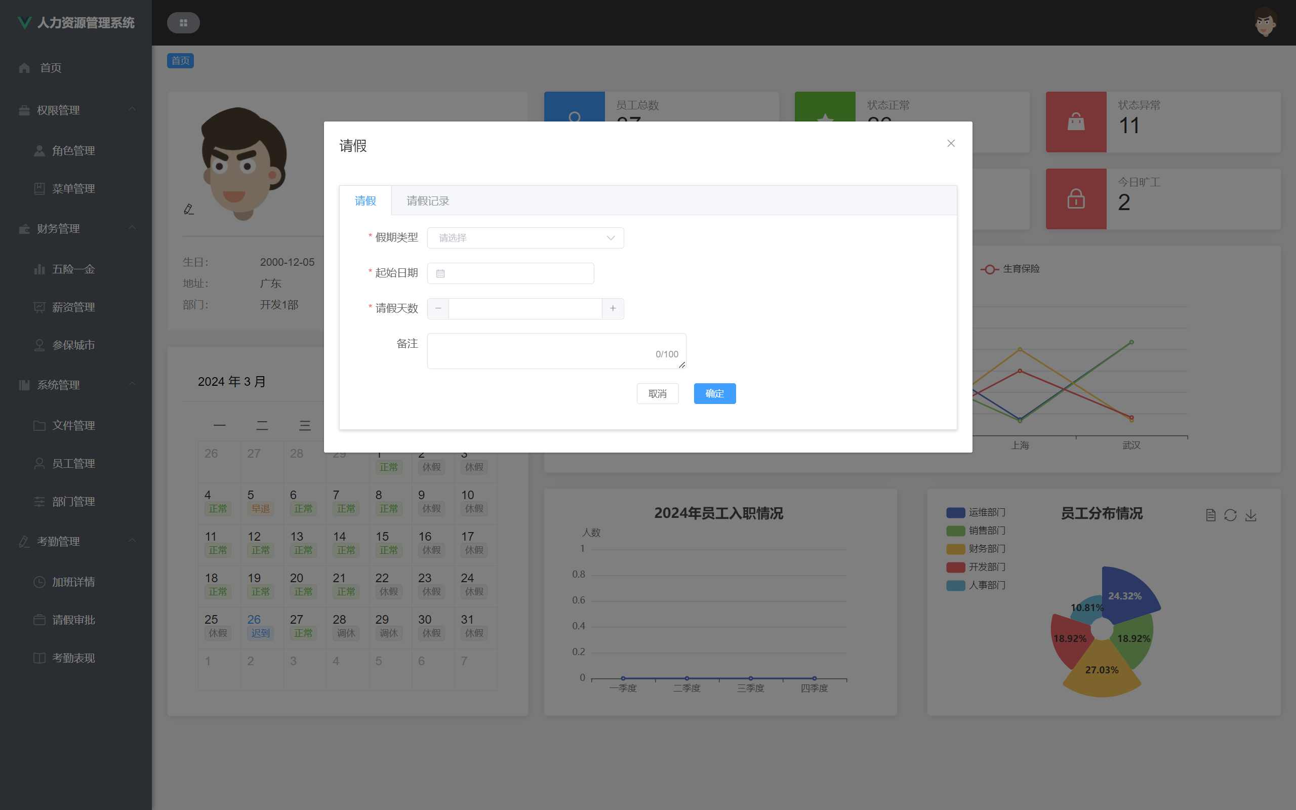 本项目是一款基于Spring Boot+Vue+ElementUI的人力资源管理系统,有权限管理、财务管理、系统管理、考勤管理等功能模块。