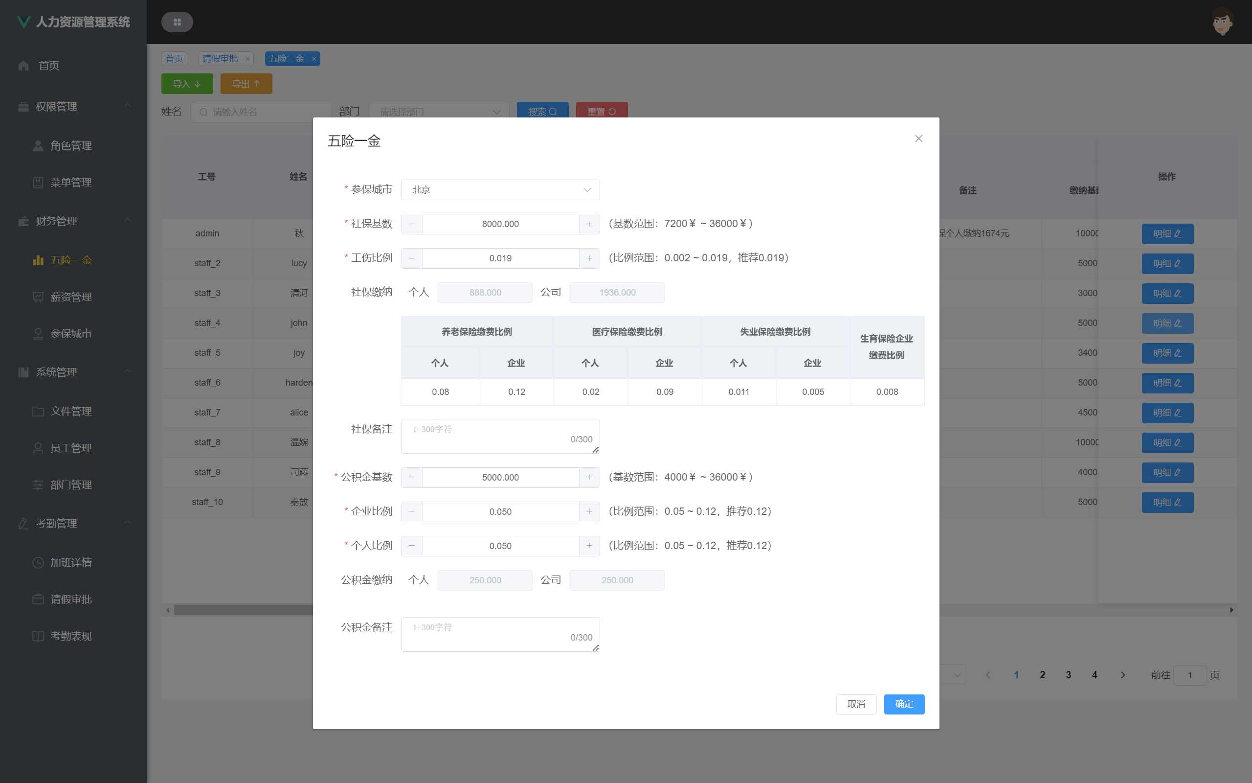 实现了对员工的五险一金进行管理,以及员工五险一金报表的导出。