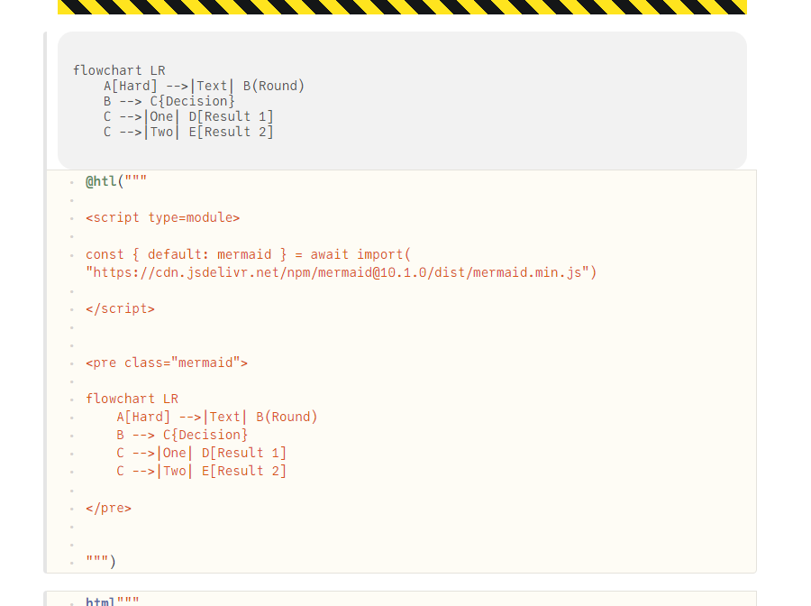 I am completely new to javascript libraries so I am probably doing something wrong. I would really like to import mermaid/js into Pluto.jl so that I can draw diagrams programmatically. But it isn't doing what I expect I tried different versions of Mermaid using separate cells, using the other import method via a 'src=', using What am I doing wrong? Copy paste the following in a Pluto.jl cell to replicate html"""