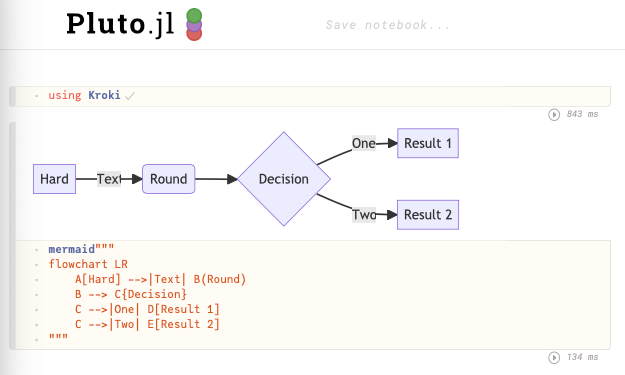 My solution to draw diagrams into Pluto.jl is Kroki.jl. It eases using mermaid a lot. Just type: using Krokiand then in a new cell: mermaid"""