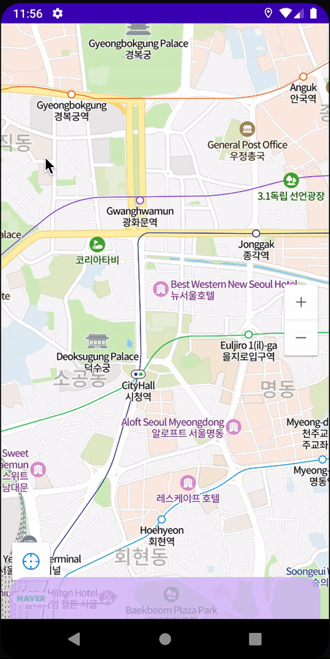 - 위치 권한을 부여하면, 현재 위치로 지도가 이동합니다.